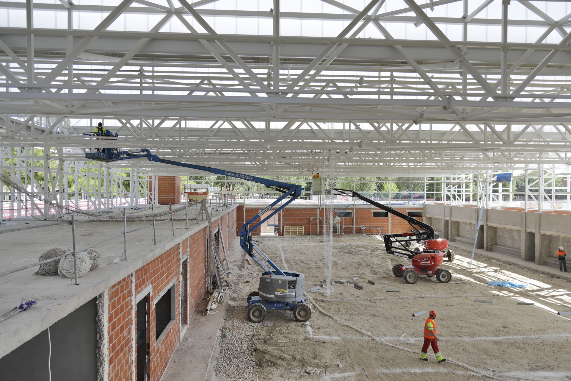 En lo relativo al estado de las obras, se indica que en el espacio dedicado a la piscina terapéutica se han finalizado los trabajos de la estructura metálica que soporta la cubierta, con siete enromes pórticos de vigas. En lo que respecta al edificio de acceso, vestíbulo y las tres salas polivalentes, ya se han finalizado los trabajos de tabiquería y se está procediendo a las diferentes instalaciones, así como de la zona de vestuarios.