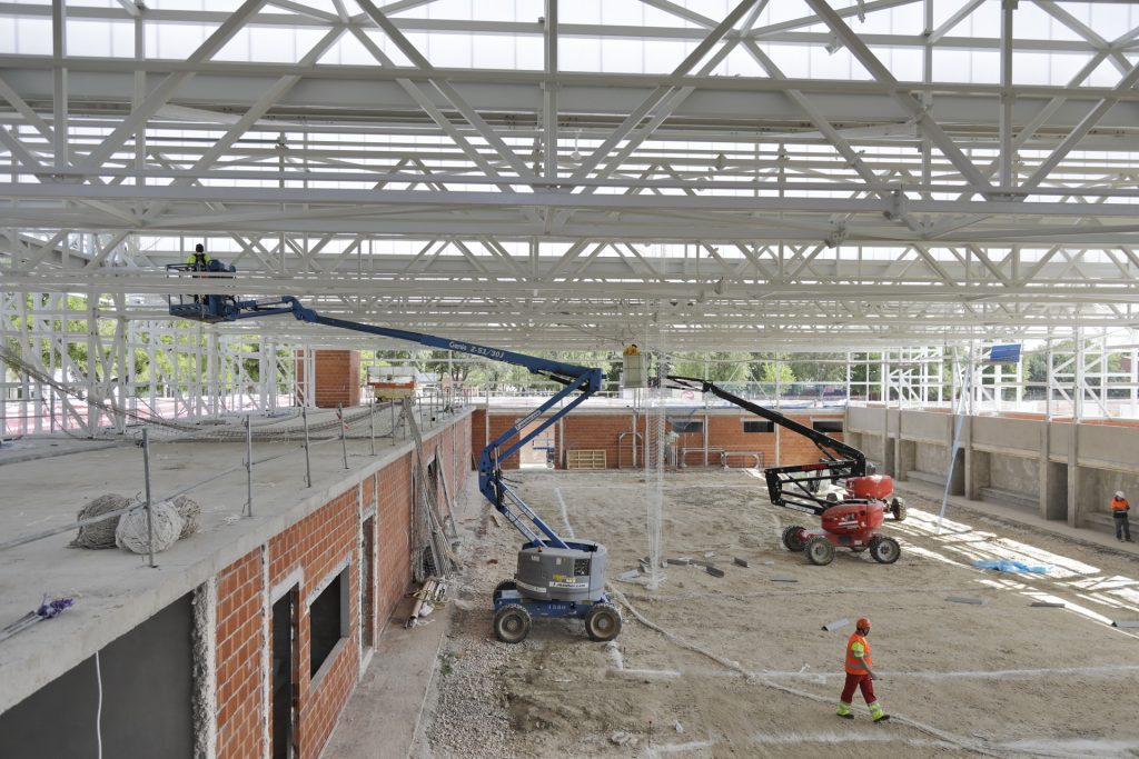 En lo relativo al estado de las obras, se indica que en el espacio dedicado a la piscina terapéutica se han finalizado los trabajos de la estructura metálica que soporta la cubierta, con siete enromes pórticos de vigas. En lo que respecta al edificio de acceso, vestíbulo y las tres salas polivalentes, ya se han finalizado los trabajos de tabiquería y se está procediendo a las diferentes instalaciones, así como de la zona de vestuarios.