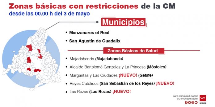 Hasta el 17 de mayo quedarán restringidas las zonas básicas de salud de Madrid capital de Vicente Muzas, en el distrito de Hortaleza, y la de Daroca, en el de Ciudad Lineal; la de Reyes Católicos en San Sebastián de los Reyes y la de Las Rozas en Las Rozas.
