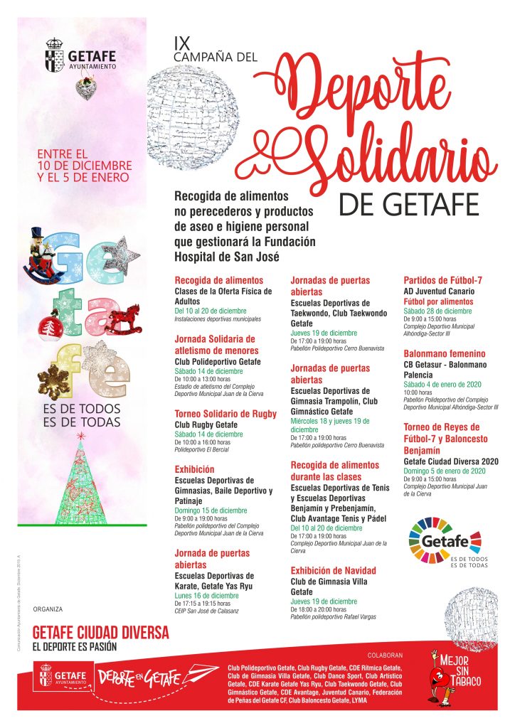 El Ayuntamiento de Getafe promueve un año más la campaña del Deporte Solidario coindiciendo con las fechas navideñas. Será la novena edición de esta iniciativa, que tendrá lugar del 10 de diciembre al 5 de enero y que propone una serie de actividades y eventos deportivos en los que se podrán donar alimentos no perecederos, así como productos y utensilios de higiene personal.