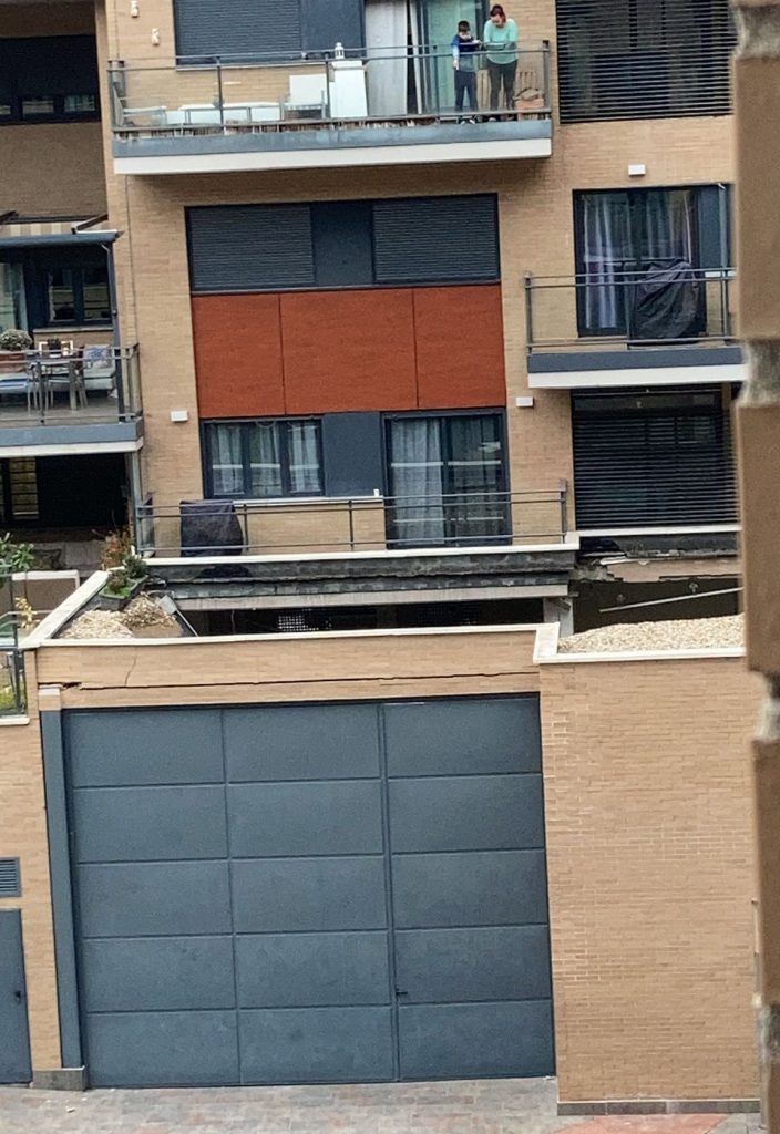 Susto en el barrio de El Bercial en Getafe. En la tarde de este martes, 23 de noviembre, se ha derrumbado parte de la cubierta del garaje de un edificio ubicado en el número 2 de la calle Elvira Lindo, frente al Corte Inglés. Inmueble que data del año 2007.