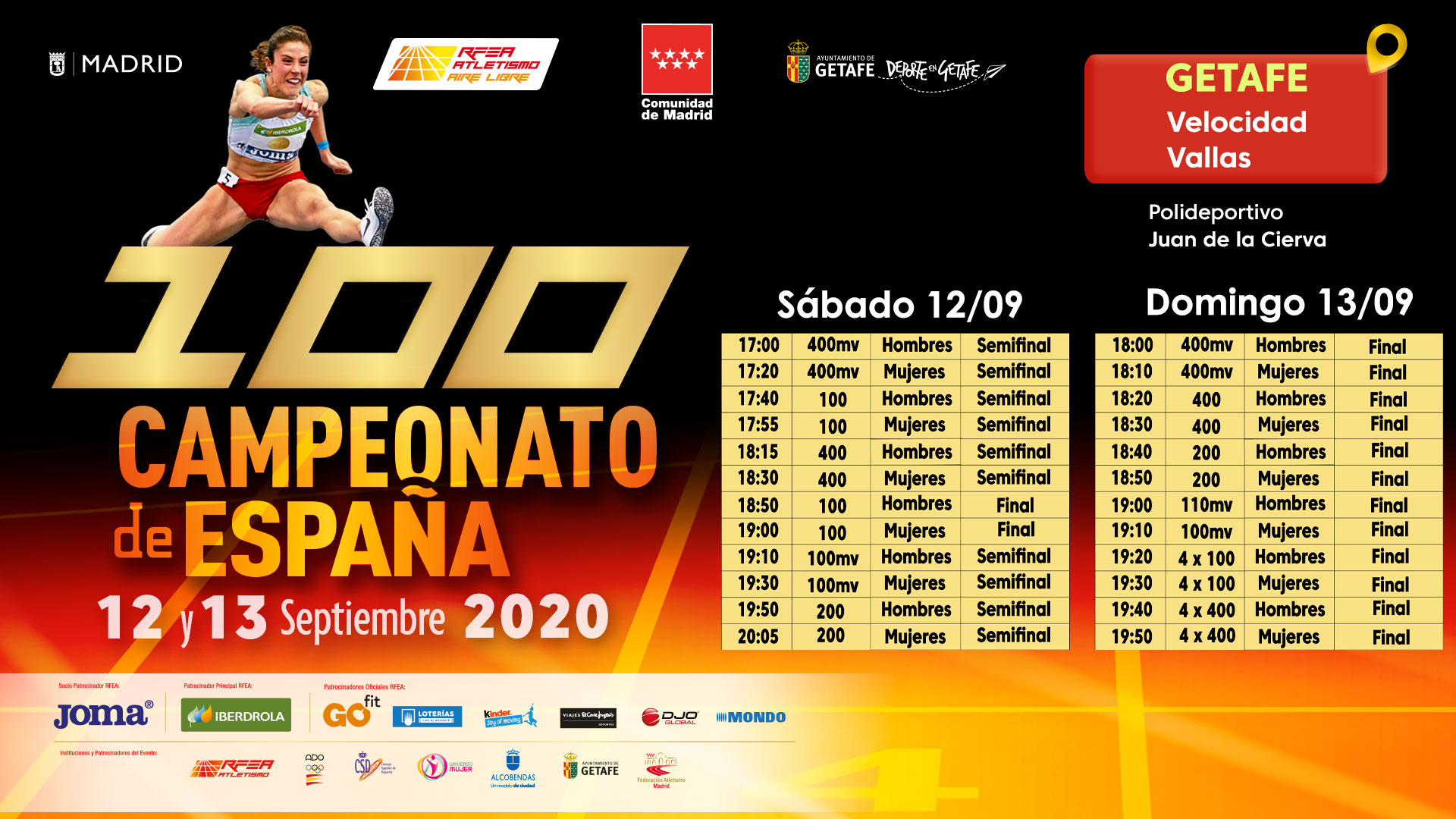 Este próximo fin de semana (12 y 13 de septiembre) llega la gran cita de esta temporada tan atípica para el atletismo español. Y es que en el año en que se celebra el centenario de la Real Federación Española de Atletismo (RFEA), además de llegar a la 100 edición del Campeonato de España absoluto, el COVID-19 ha ocasionado que por primera vez en este largo siglo de campeonatos el evento por excelencia vaya a celebrarse en cuatro sedes a la vez: Getafe, Madrid (Vallehermoso y Moratalaz) y Alcobendas.