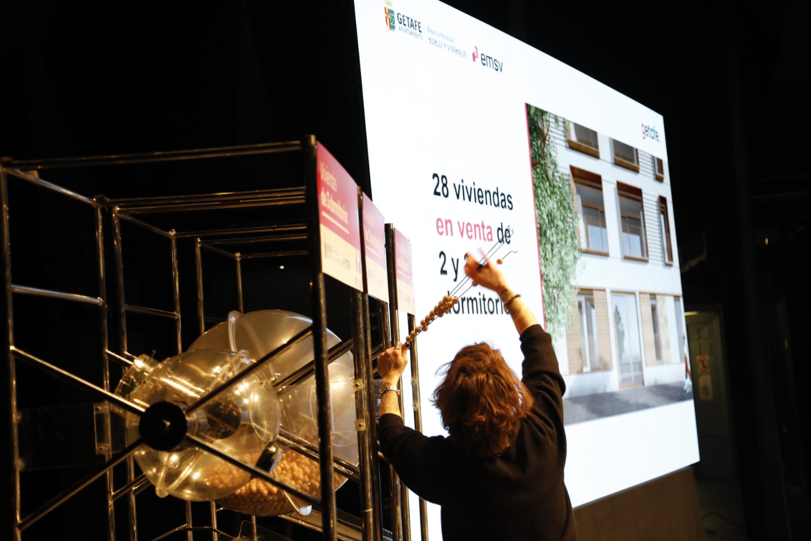 El pasado lunes 8 de enero, el Teatro Federico García Lorca de Getafe acogió el sorteo público, ante notario y mediante el sistema de bombos de las 28 viviendas públicas que va a construir la EMSV en el Paseo de la Estación. Las más de 4.000 familias de Getafe que han solicitado alguna de estas 28 viviendas, pudieron asistir bien in situ o bien por streaming.