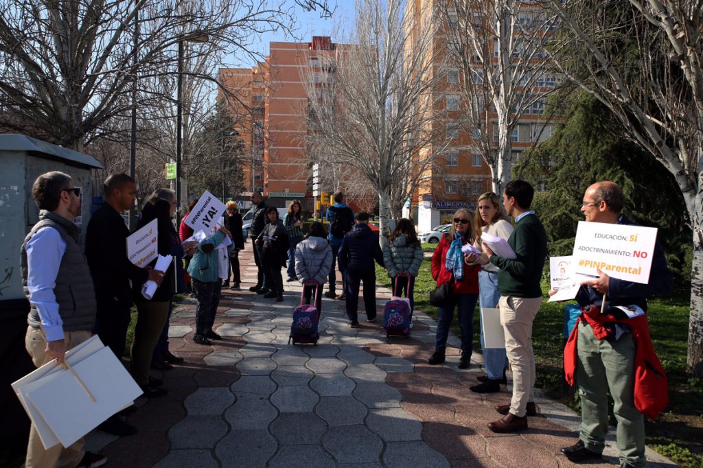 Los integrantes de la plataforma, que han portado pancartas con los mensajes ‘Educación sí, adoctrinamiento, no: pin parental ya’, han decidido no repartir los panfletos y limitarse a ofrecer información a los padres que se han acercado a ellos.