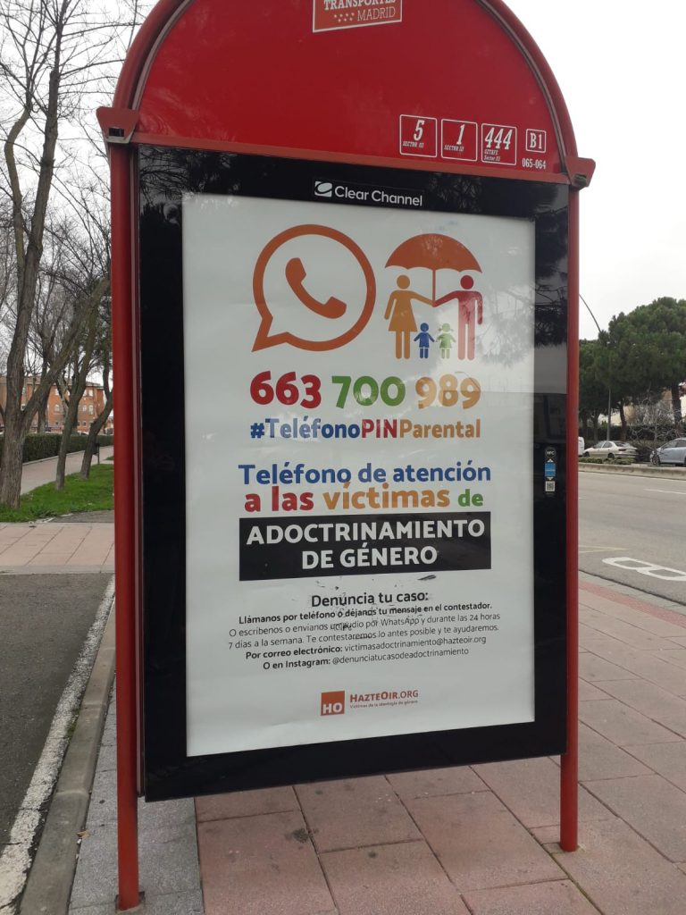 Hazte Oír ha publicitado en 150 marquesinas de autobuses interurbanos en varios puntos de la región para publicitar un teléfono de atención a «víctimas de adoctrinamiento de género». Entre esas ciudades se encuentran Getafe y Leganés.