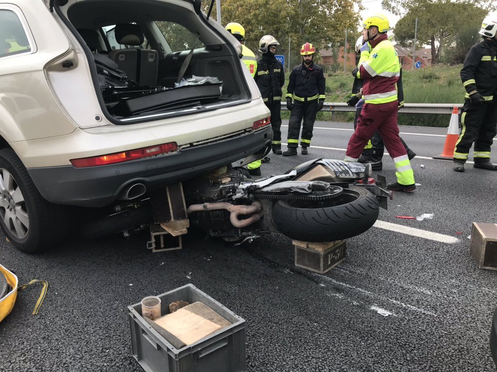 Debido a la magnitud del siniestro, los bomberos y la Guardia Civil han tenido que intervenir junto a los efectivos sanitarios. Éstos han trasladado al Hospital Doce de Octubre con pronóstico grave al motorista, cuyo vehículo ha quedado bajo las ruedas de un coche.