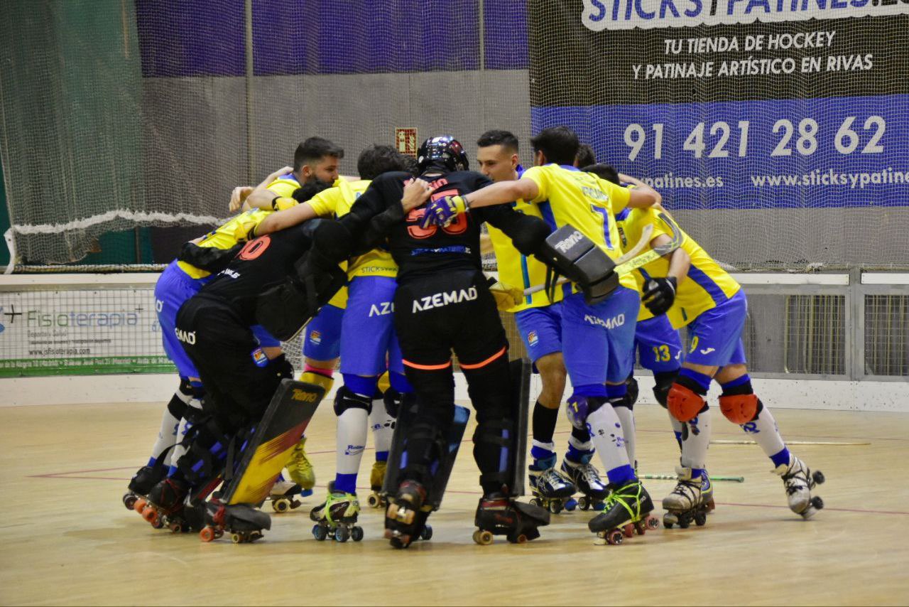 Jugadores del Patín Alcorcón haciendo 'piña' sobre la cancha