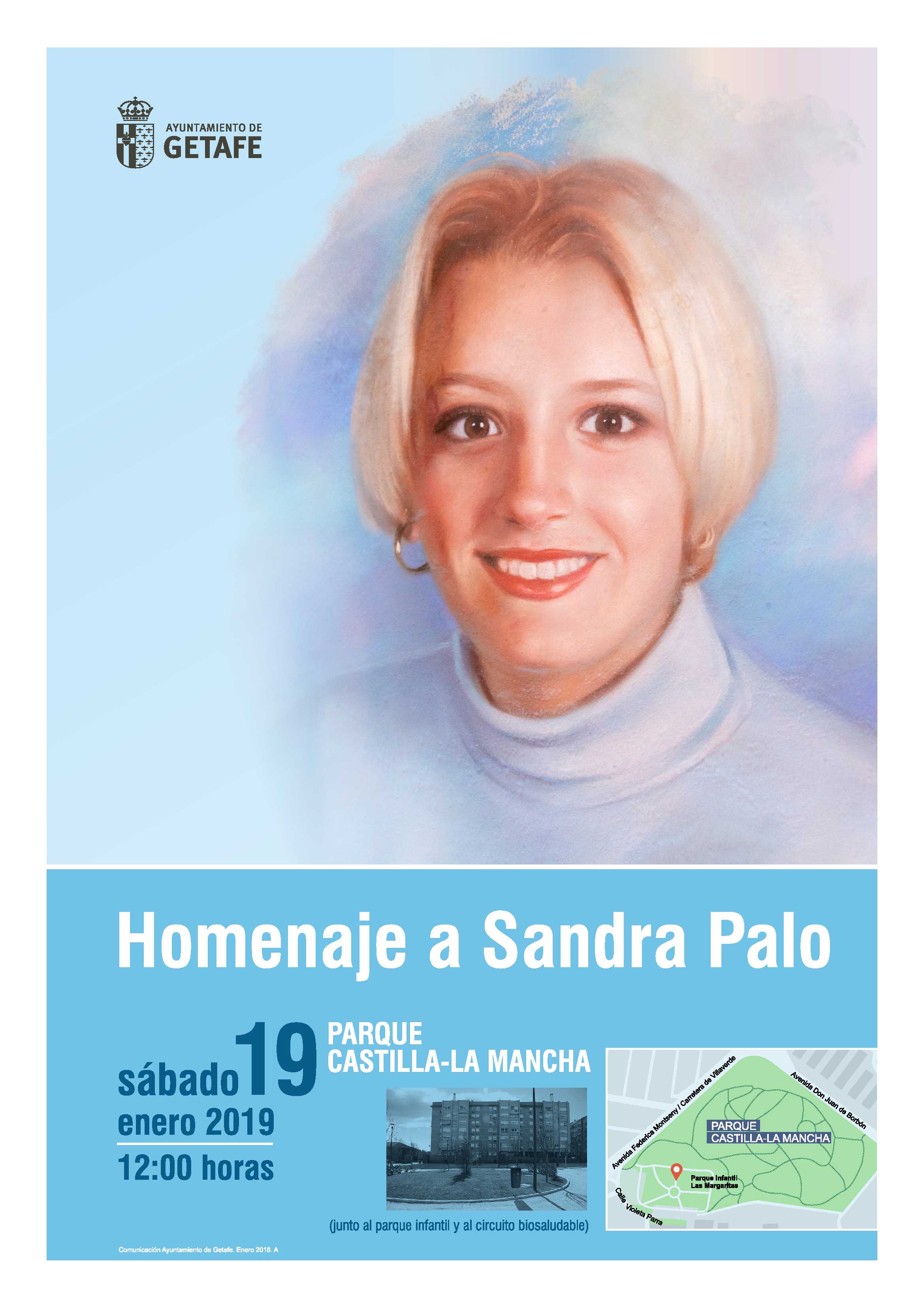 Getafe rinde homenaje a Sandra Palo, vecina de la ciudad que con 22 años fue secuestrada, asesinada, violada y quemada en Leganés el 17 de mayo de 2003 y cuyos responsables hoy están en la calle. El acto de recuerdo tendrá lugar este sábado, 19 de enero, a las 12.00 horas en el parque de Castilla la Mancha, junto al parque infantil y el circuito biosaludable.