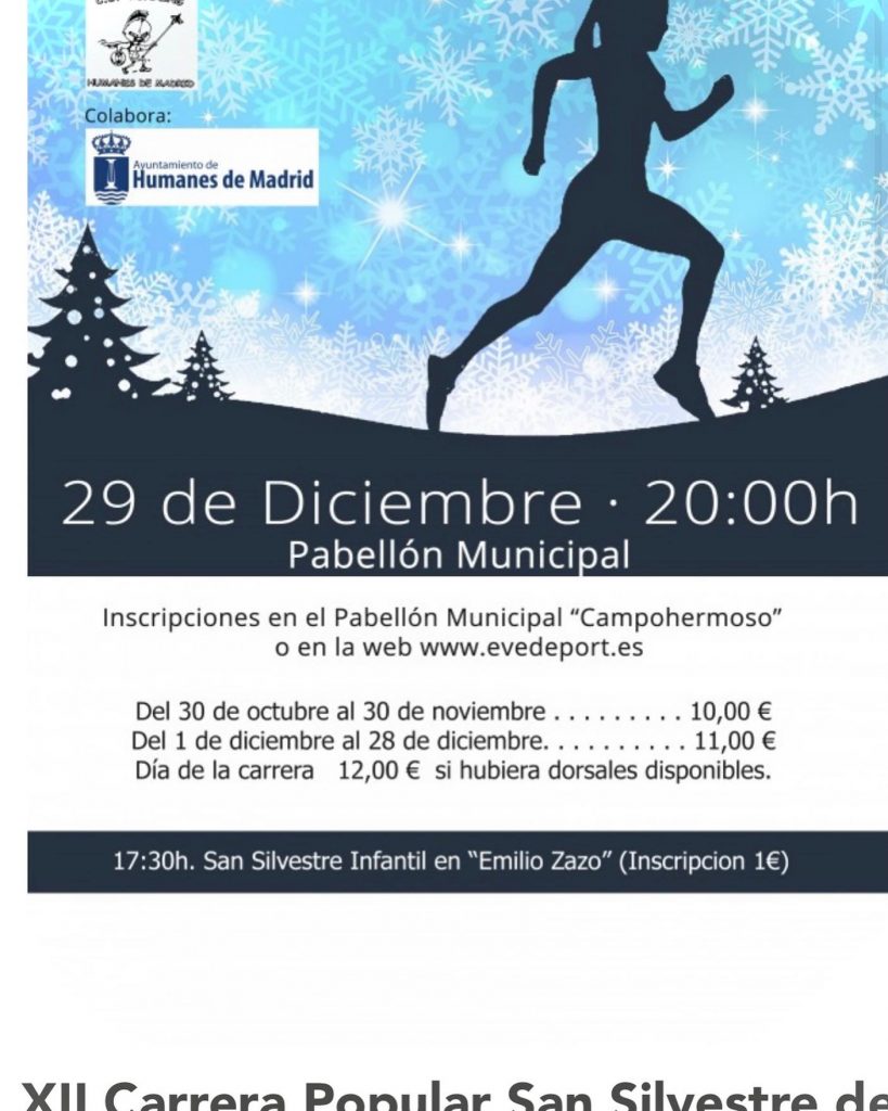 El viernes 29 de diciembre tendrá lugar una nueva edición, la 12ª, de la San Silvestre de Humanes, prueba que organiza el CD Running Humanes con la colaboración de Ayuntamiento y que partirá desde los aledaños del pabellón Campohermoso a las 20:00 horas. Los participantes, hasta un máximo de 500 por razones de seguridad, deberán completar el habitual circuito de 6 kilómetros.