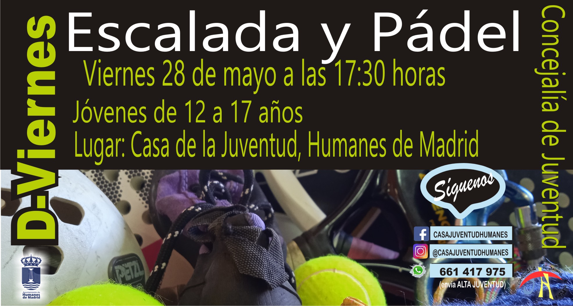 La Concejalía de Juventud del Ayuntamiento de Humanes de Madrid ha organizado una actividad deportiva de escalada y pádel para este viernes 28 de mayo, a partir de las 17.30 horas en el centro deportivo Vicente Temprado. Esta actividad forma parte de la programación D-Viernes, está dirigida a jóvenes entre los 12 y 17 años del municipio y por motivos sanitarios sólo podrán participar 10 personas.