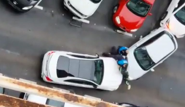 El conductor, tras un forcejeo en el que perdió el abrigo y una zapatilla, logró escapar vestido solo con un chándal, como se puede ver en las imágenes que han grabado varios vecinos, y se encuentra actualmente en busca y captura.