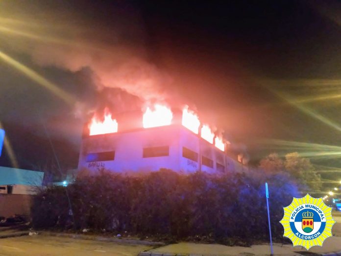 Bomberos de Alcorcón y Leganés han intervenido en la madrugada del miércoles al jueves 2 de enero en el aparatoso incendio que se ha originado en una nave del polígono industrial de Urtinsa. La fábrica, ubicada en la calle Yunque entre ambos términos municipales, se encontraba abandonada.