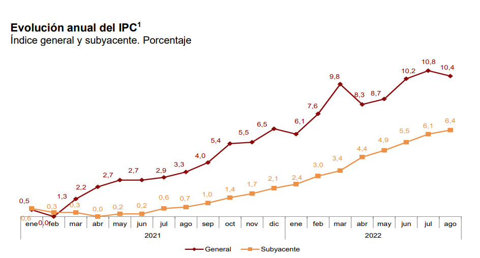 Según el INE, la moderación del IPC interanual hasta el 10,4% se debe, principalmente, a la bajada de los precios de los carburantes y, en menor medida, de los combustibles líquidos. Por contra, en agosto subieron los precios de la electricidad (que se encuentran en máximos desde la entrada en vigor de la ‘excepción ibérica), de los alimentos, de la restauración y de los paquetes turísticos, entre otros.