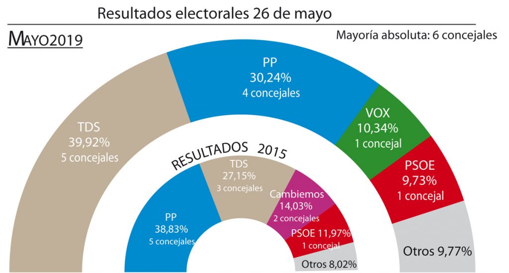 En 2015 el TDS obtuvo el 27,15% de los sufragios, siendo la segunda fuerza política más votada con tres concejales. Iván Fernández lograría la Alcaldía tras conseguir el voto de Cambiemos y PSOE, formando un bloque de seis concejales de apoyo al Gobierno local. El PP se quedaría en la oposición a pesar de ser el partido más votado y conseguir cinco concejales.
