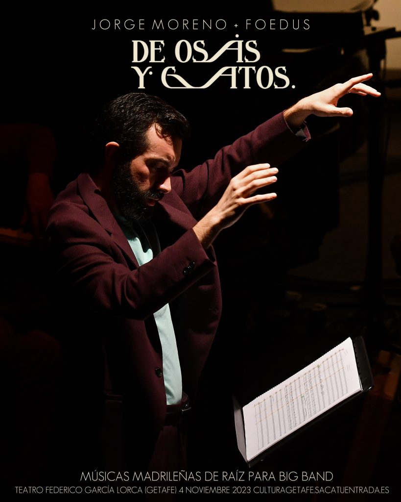 Jorge Moreno presentará junto a su big band, Foedus, su disco De osas y gatos el sábado 4 de noviembre (19 horas) en el Teatro Federico García Lorca de Getafe. En este trabajo discográfico, el trombonista y compositor leganense, formado en el Conservatorio Profesional de Getafe, ha recopilado melodías, ritmos e incluso instrumentos prácticamente olvidados de la tradición musical de distintos lugares de la Comunidad de Madrid para construir con ellos una suite jazzística para una formación de casi veinte músicos.