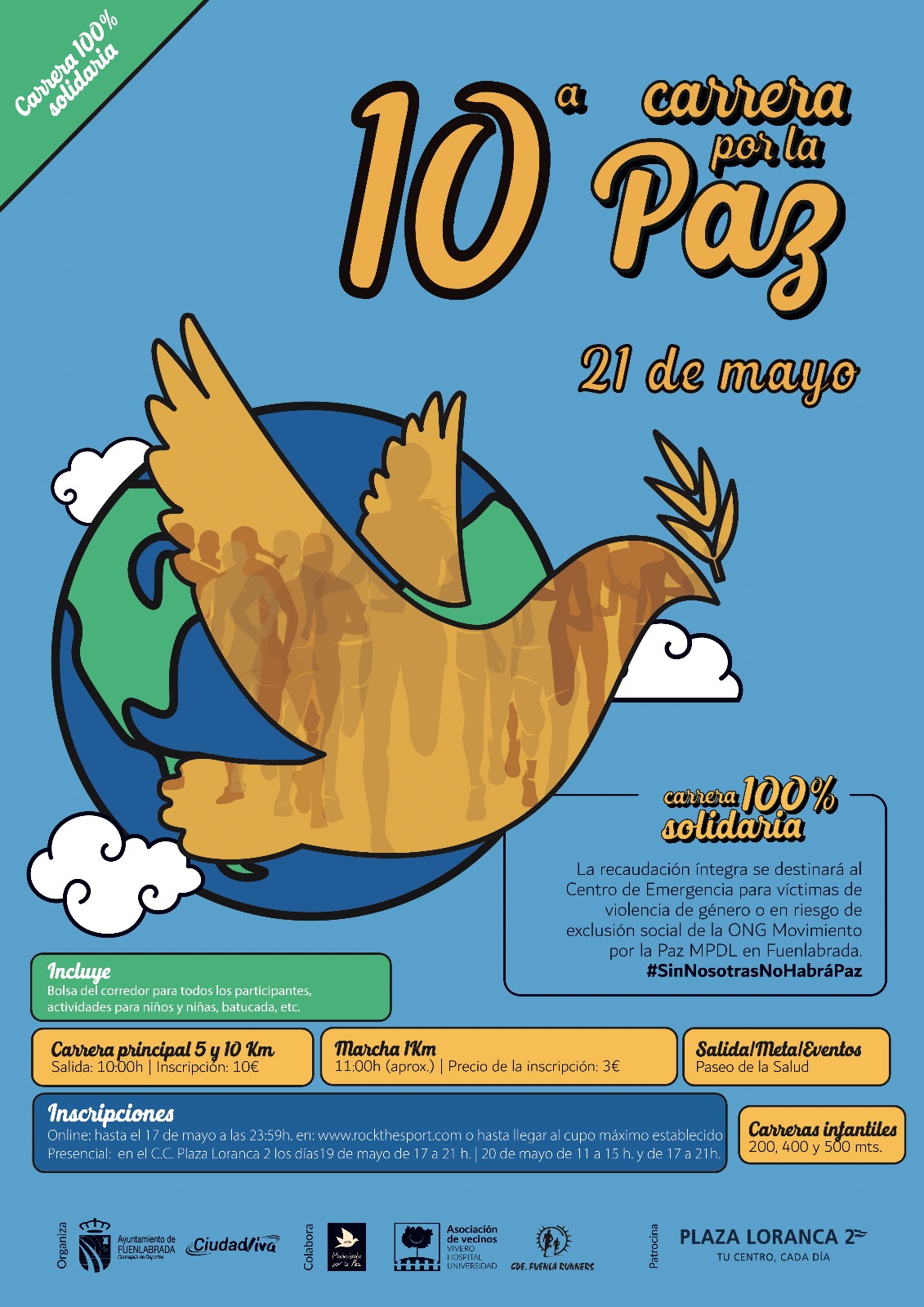 Las calles de Fuenlabrada acogerán el próximo 21 de mayo la décima edición de la ya tradicional Carrera por la Paz, evento deportivo y solidario que ofrece la posibilidad de participar en las carreras de 5 ó 10 kilometros, o en la marcha de 1,5 kiómetros.