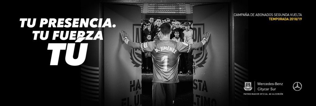 Coincidiendo con el nuevo año, la AD Alcorcón ha lanzado su campaña de abonos para la segunda vuelta del presente campeonato liguero, en el que el conjunto alfarero marcha quinto clasificado a punto de completarse una primera vuelta para enmarcar por parte de los de Cristóbal Parralo, que han llegado incluso a ostentar el liderato. El eslogan elegido para la campaña es ‘Tu presencia, tu fuerza, tú’, y el protagonista del vídeo promocional es el guardameta Dani Jiménez.