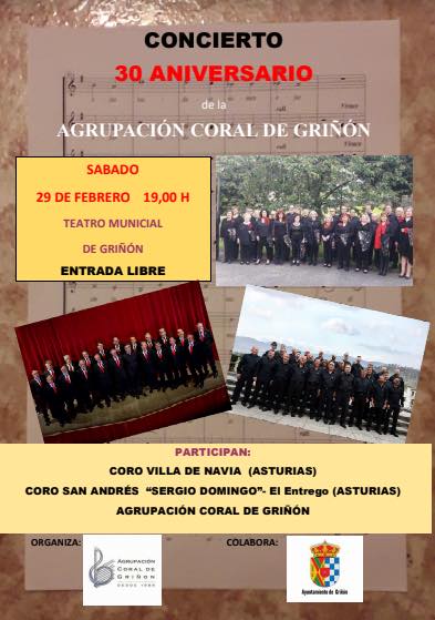 La Agrupación Coral de Griñón, en colaboración con el Ayuntamiento, ha organizado un concierto para festejar el treinta aniversario de su creación. La celebración tendrá lugar ‪el sábado, 29 de febrero,‬ en el Teatro Municipal de Griñón ‪a las 19.00‬ horas.