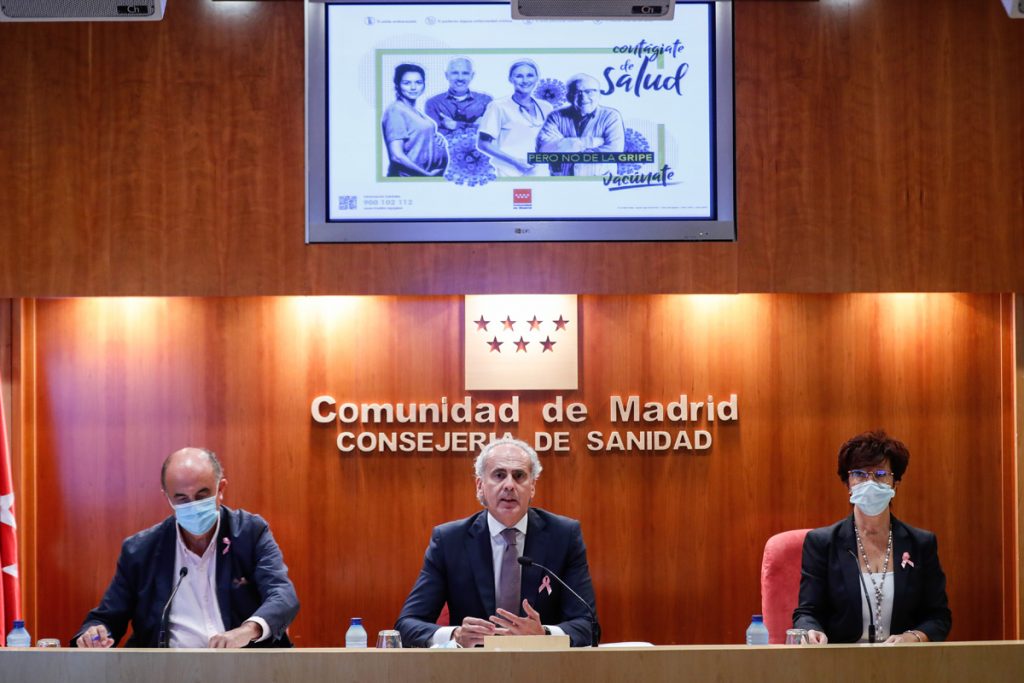 El consejero de Sanidad de la Comunidad, Enrique Ruiz Escudero, acompañado por el viceconsejero de Asistencia Sanitaria y Salud Pública, Antonio Zapatero, y la directora general de Salud Pública, Elena Andradas, ha presentado la campaña antigripe 2021/2022, que se extenderá hasta el próximo 31 de enero.