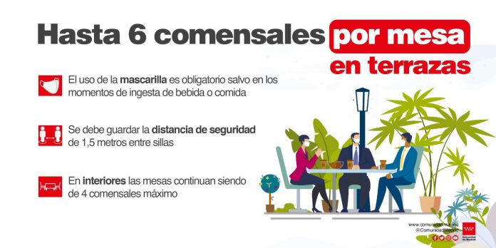 La Comunidad de Madrid amplía desde este viernes el número de personas que pueden compartir mesa en las terrazas, que pasa de cuatro a un máximo de seis, mientras que se mantiene el límite de cuatro en el interior de los establecimientos, y continúa suspendido el servicio en barra.