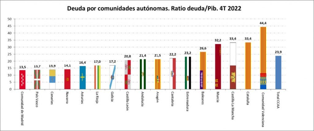 Si se compara con el resto de comunidades autónomas, la deuda de Madrid es 2,5 veces menor que Cataluña, un 33,4% (-49.506 millones de euros), y 3,3 veces por debajo de la Comunidad Valenciana, un 44,4% (-20.211 millones).