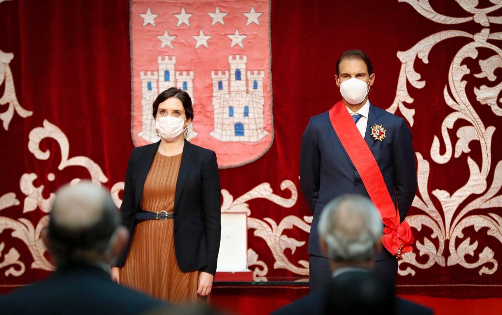 La presidenta de la Comunidad de Madrid, Isabel Díaz Ayuso, ha impuesto este jueves a  Rafa Nadal su máxima distinción, la Gran Cruz de la Orden del Dos de Mayo, un reconocimiento al “mejor deportista español de todos los tiempos” por su “descomunal palmarés deportivo, pero también a sus méritos extraordinarios como persona”. Es un hombre “lleno de valores: la superación frente a la adversidad, la perseverancia, el esfuerzo, la disciplina, el sacrificio, el respeto al rival o la humildad”, ha apostillado.