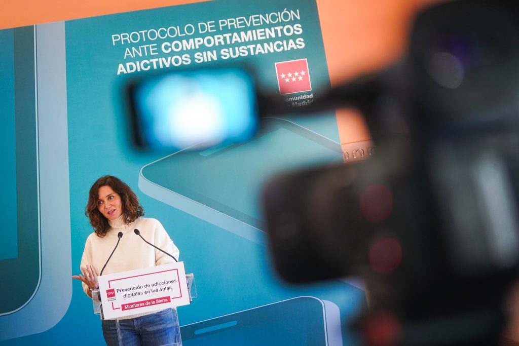 La presidenta de la Comunidad de Madrid, Isabel Díaz Ayuso, ha anunciado este martes la puesta en marcha de un protocolo, «pionero en España», para prevenir de manera precoz las adicciones comportamentales a las pantallas (Internet, redes sociales y teléfonos móviles), los juegos, los ciberjuegos, las apuestas y la pornografía entre los alumnos.