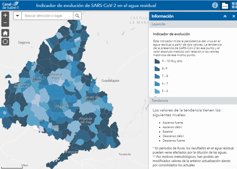 Canal de Isabel II ha puesto a disposición de los ciudadanos un mapa interactivo de libre acceso, en el que pueden consultar la tendencia en cada zona, fecha del último análisis validado, indicador de la presencia del virus y un valor comparativo del último dato con respecto a los anteriores en ese mismo punto. La web https://www.canaldeisabelsegunda.es/mapa-vigia ha recibido hasta la fecha más de medio millón de visitas.
