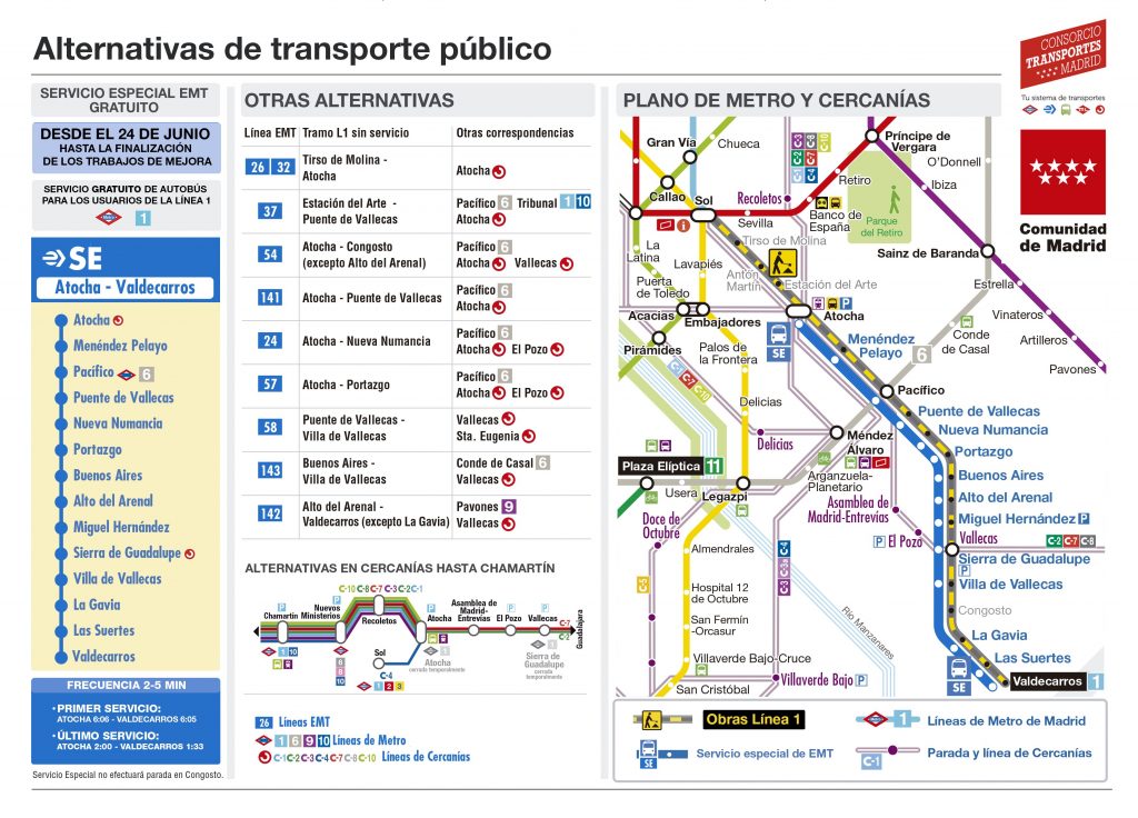 Durante el periodo en el que se efectuarán estos trabajos de mejora, se habilitará un servicio sustitutivo de autobuses gratuito, operado por la Empresa Municipal de Transportes (EMT), que cubrirá en superficie el tramo afectado, de más de 22 kilómetros. Los viajeros dispondrán de información puntual sobre las alternativas de las que disponen, y la dotación de vehículos variará en función de la franja horaria y afluencia de personas, de manera que la frecuencia de paso será entre 2 y 5 minutos.