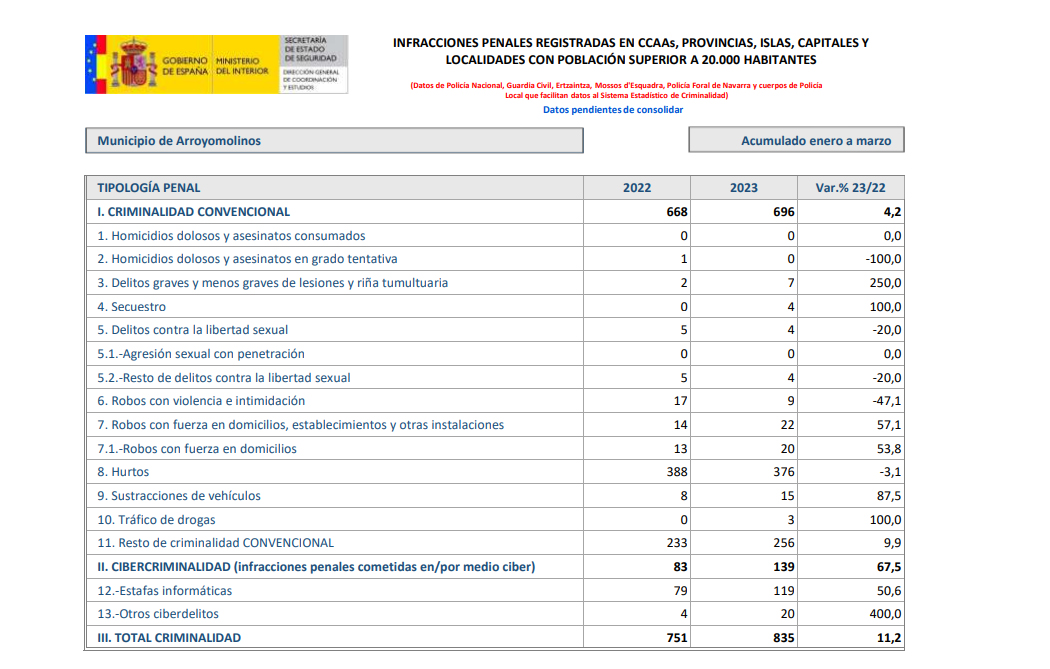 De entre los municipios madrileños con una población superior a 20.000 habitantes, Arroyomolinos se encontraba entre las localidades con una subida de la criminalidad por encima de la media nacional y regional. En concreto, entre enero y marzo de este año, aumentaron las infracciones penales un 11%, mientras en municipios vecinos como Móstoles, apenas creció un 0,5% y en Navalcarnero, por el contrario, bajó un 6,5%.
