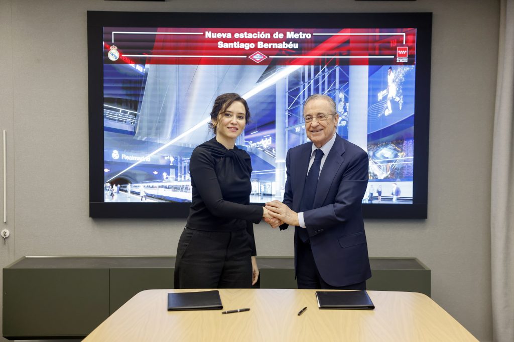 La presidenta de la Comunidad, Isabel Díaz Ayuso, ha firmado este jueves un protocolo con el presidente del Real Madrid Club de Fútbol, Florentino Pérez, en las oficinas del club en Torre Europa, para coordinar las obras de accesibilidad, ampliación y remodelación de dicha estación.