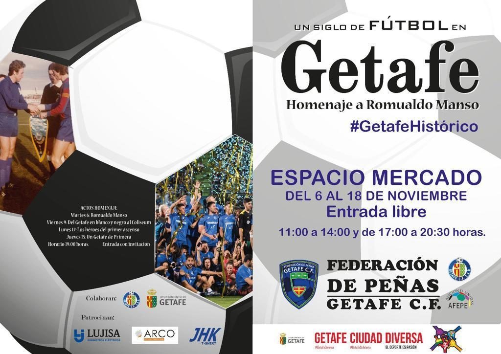 El Espacio Mercado de Getafe albergará entre el 6 y el 18 de noviembre la exposición ‘Un siglo de fútbol en Getafe, homenaje a Romualdo Manso’,  un evento organizado por la Federación de Peñas del Getafe con la colaboración, entre otros, del Getafe CF y el Ayuntamiento de Getafe.