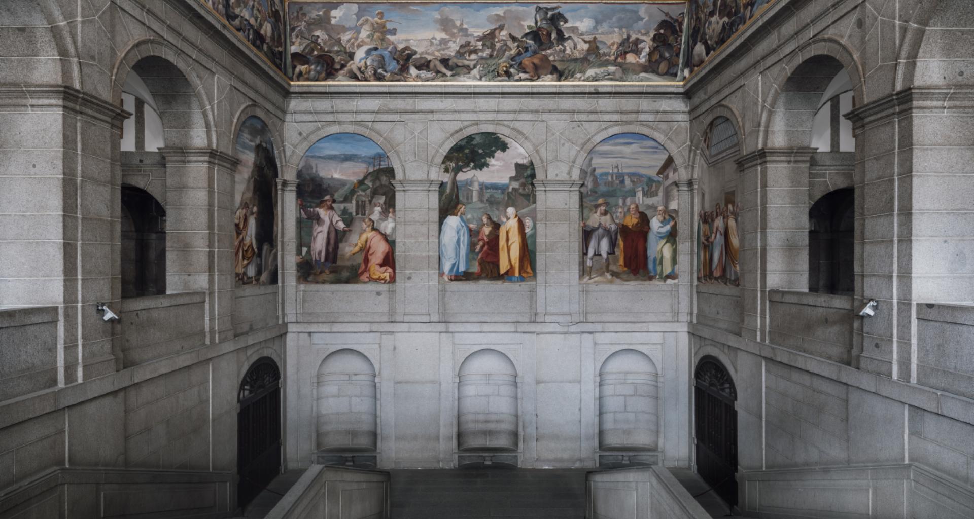 Entre sus dependencias, destaca la majestuosa escalera renacentista decorada íntegramente con pinturas murales en el siglo XVII y cuyo programa decorativo se desarrolla como un gran trampantojo que cubre por completo las paredes y el techo.