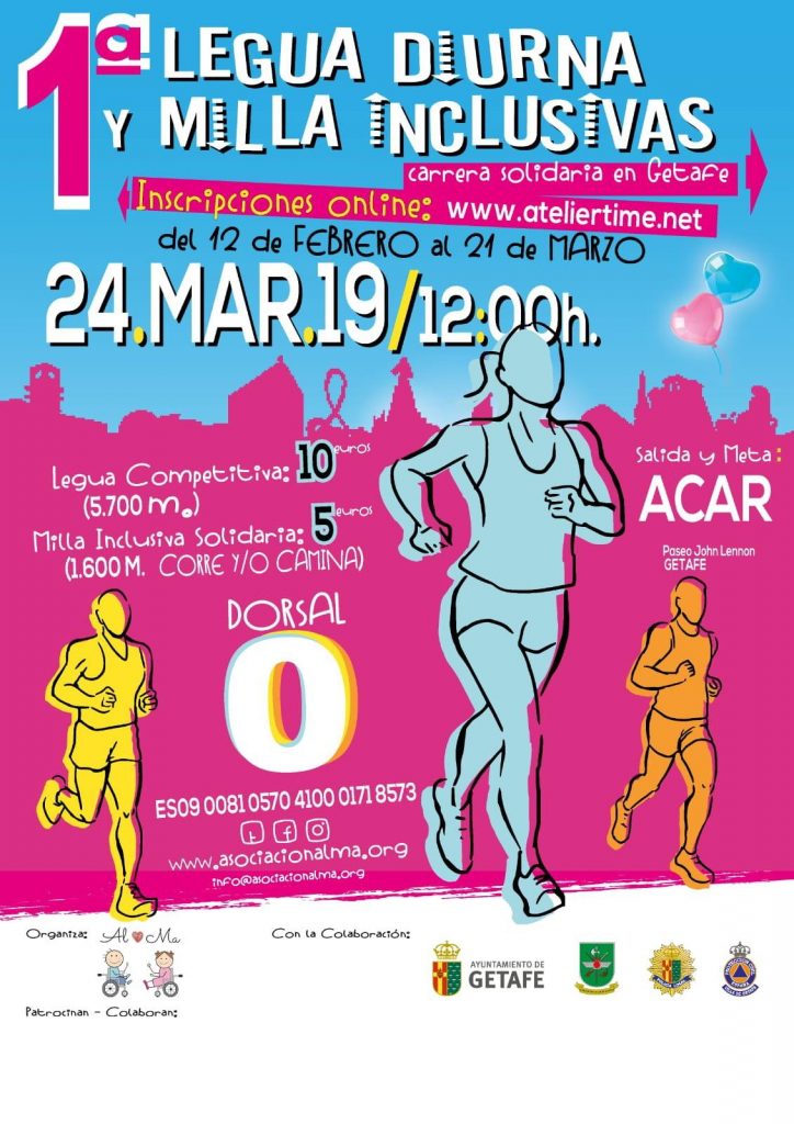 El próximo 24 de marzo es la fecha elegida finalmente para la celebración de la ‘I Legua y Milla Inclusiva’ de Getafe, prevista inicialmente para el pasado 27 de octubre pero que hubo de suspenderse por motivos de seguridad a consecuencia de las inclemencias meteorológicas. La organización de esta carrera solidaria corre a cargo de la Asociación Alma, que lucha por los intereses y los derechos de los niños pluridiscapacitados.
