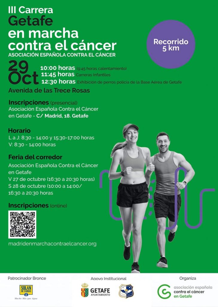 Los organizadores de la III Carrera solidaria ‘Getafe en marcha contra el cáncer’ ultiman los preparativos de cara a su celebración el domingo día 29. La Asociación Española Contra el Cáncer (AECC) destinará los beneficios obtenidos por las inscripciones a la financiación de proyectos de investigación, así como a la prestación de servicios gratuitos a pacientes oncológicos y familiares.