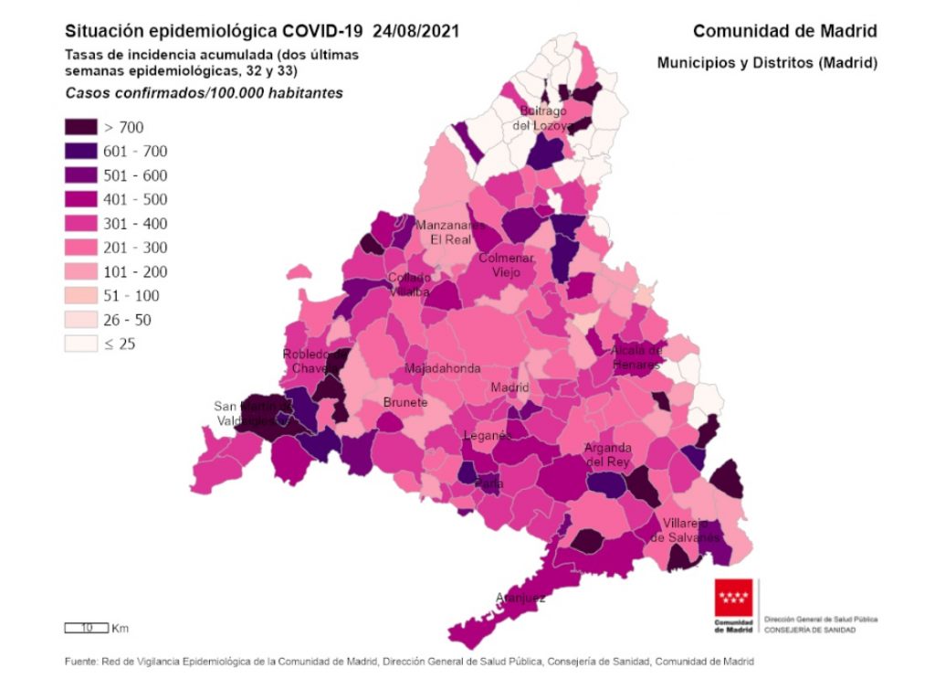 Por encima de 400 sin embargo, continúa en Fuenlabrada y Getafe. Así Fuenlabrada registra una incidencia de 405 casos y Getafe 401 por 100.000 habitantes a 14 días.