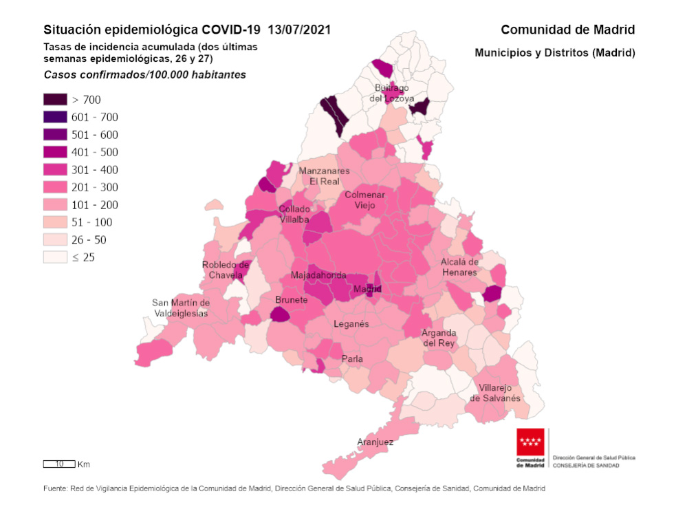 La incidencia acumulada en la Comunidad de Madrid ha repuntado en la última semana, hasta situarse en 234 casos por cada 100.000 habitantes en los últimos 14 días, con diez localidades por encima de 200 casos y el municipio de Boadilla a la cabeza.