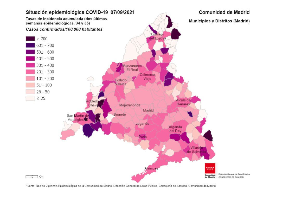La Comunidad de Madrid ha actualizado a 7 de septiembre el balance epidemiológico a 14 días de la región, y la tendencia en la quinta ola de Covid-19 sigue siendo descendente en las principales ciudades de más de 50.000 habitantes del sur, volviendo a niveles del mes de mayo.