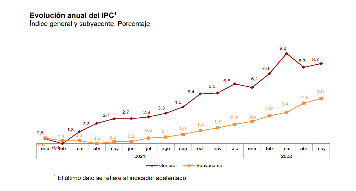 El Índice de Precios de Consumo (IPC) subió un 0,8% en mayo en relación al mes anterior e incrementó su tasa interanual cuatro décimas, hasta el 8,7%, según los datos publicados este lunes por el Instituto Nacional de Estadística (INE). Se trata de la mayor subida de la inflación en un mes de mayo desde el año 2018.