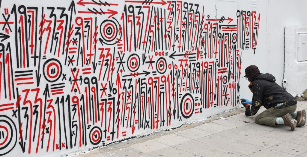 Durante estos días el artista catalán trabaja en la fachada del polideportivo Fernando Martín que ocupa la calle Hungría, realizando un mural en colores rojos y negros, en el que mezcla el arte figurativo y el abstracto y donde predominan símbolos matemáticos.