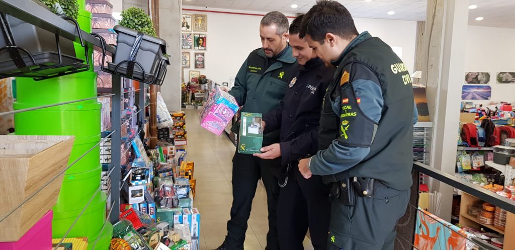 Agentes de la Policía Local y la Guardia Civil de Arroyomolinos vigilan durante estos días la venta de juguetes y pirotecnia en el municipio. En la campaña ‘La seguridad no es un juego’ participan también miembros del Seprona e Intervención de Armas, Fiscal y Fronteras.