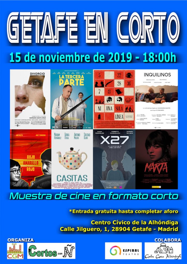 El festival de cortometrajes Cortos con Ñ y la Asociación Comunidad Getafe Media organizan para el 15 de noviembre la primera edición del festival de cine Getafe en Corto, que arrancará a las 18.00 horas con la proyección de varias películas en el centro cívico de La Alhóndiga.