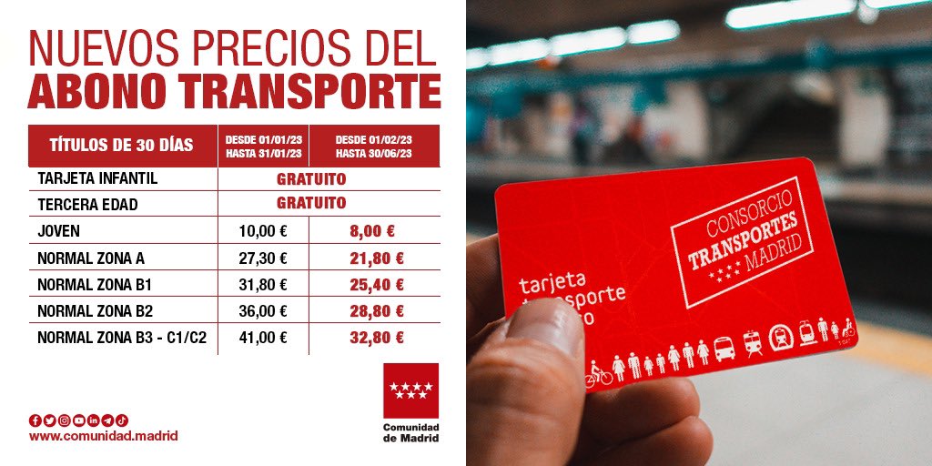 Así, a partir del 1 de enero, el Abono Joven 30 días, del que pueden hacer uso los menores de 26 años, seguirá costando 10 euros, y en febrero se reducirá a 8; el Normal A 27,3 y 21,8 euros respectivamente; el B1, 31,8 y 25,4 euros; el B2, 36 y 28,8 euros, y la zona unificada B3-C1/C2 se vuelve a quedar en 41 el mes de enero para bajar después a 32,8 euros.