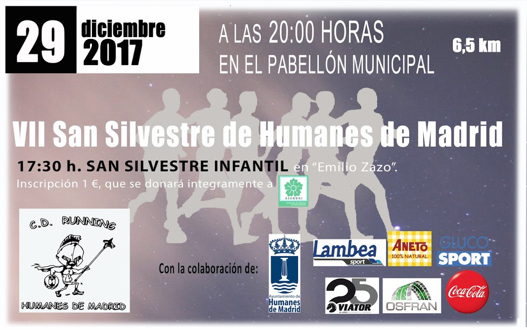 El viernes 29 de diciembre, a las 20.00 horas, se dará el pistoletazo de salida a la séptima edición de la San Silvestre de Humanes organizada por el CD Running Humanes, y las perspectivas no pueden ser más optimistas porque este jueves se han superado las 350 inscripciones, 250 de ellas para la prueba absoluta, que incluye un recorrido de 6,5 kilómetros.