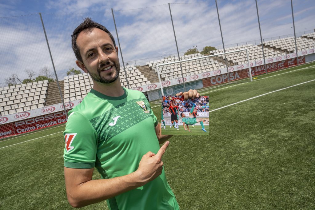 Carlos Martínez posa con la nueva equipación y una foto de su chilena (foto: CD Leganés)