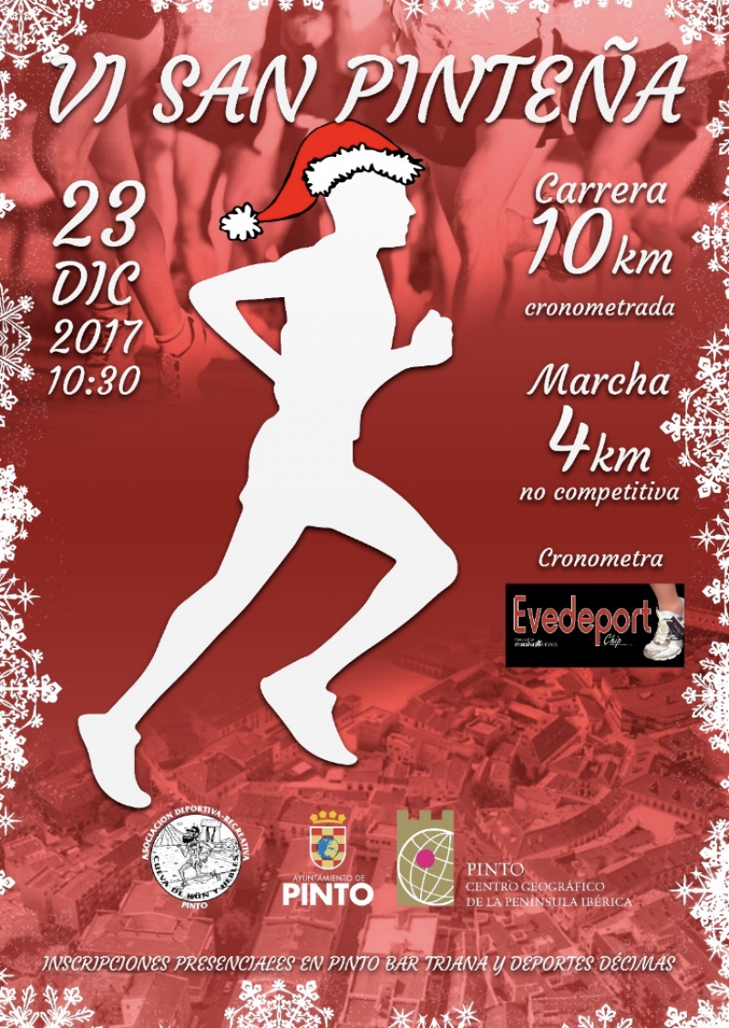 Como cada año desde hace seis y coincidiendo con las fechas navideñas vuelve fiel a su cita una nueva edición de la San Pinteña que organiza la Asociación Deportiva Cueva Kun y Hebles. Tendrá lugar el sábado 23 de diciembre e incluye una carrera de 10 kms. (salida a las 10.30 desde el auditorio del parque Juan Carlos I) y una marcha de 4 kms. no competitiva (salida desde la plaza del Egido a las 11.00).