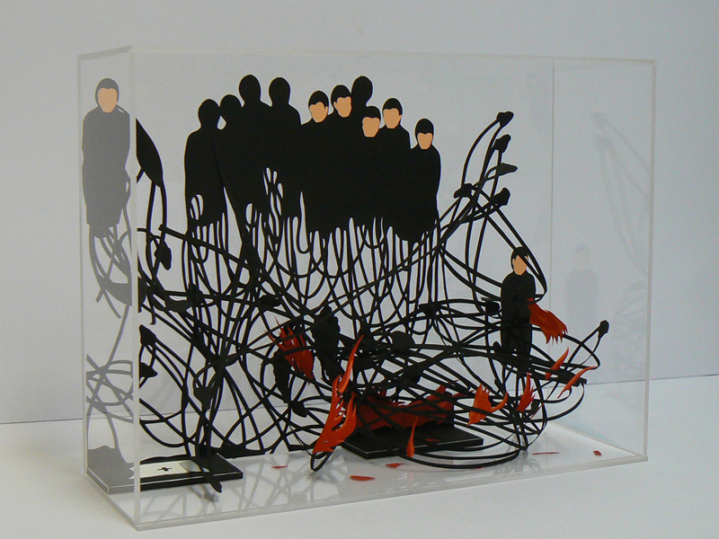 ‘Esculturas de sombras’ es el título de la muestra de Javier Pulido. Un trabajo fronterizo entre la pintura y la escultura en el que reflexiona sobre la adaptación emocional ante el reto de la supervivencia cotidiana. La muestra combina sus características cajas transparente con obras recientes de sus collages pictóricos. Se puede ver en la sala verde.