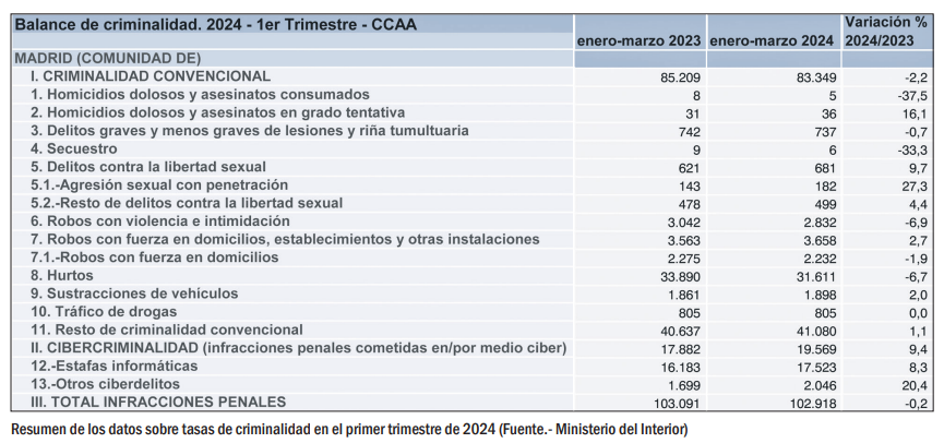 los 60,0 en el primer trimestre de 2024. Eso significa un descenso de apenas el 0,2%, desde las 411.782 infracciones penales de 2023 a las 411.609 registradas en los últimos 12 meses.