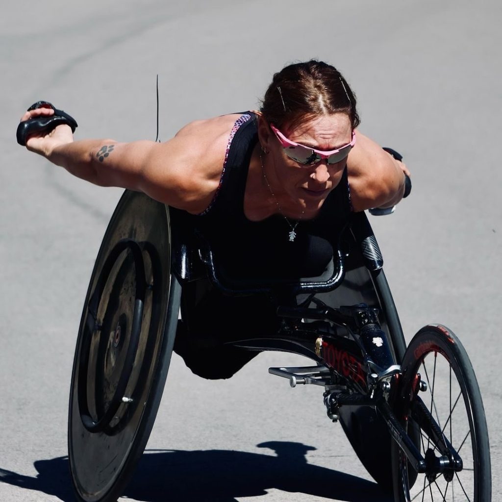 Eva Moral, durante el segmento de carrera en silla de ruedas