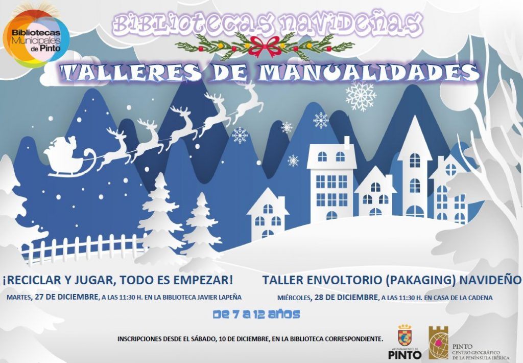 Las bibliotecas de Pinto ofrecen, en la semana del 27 al 30 de diciembre, diversas actividades para niños a partir de 3 años acompañados. Las actividades para los más pequeños corren a cargo de Aurora Maroto; mientras que los talleres para chicos entre 7 y 12 años están dirigidos por En Volandas. Es necesario inscribirse en la biblioteca correspondiente.